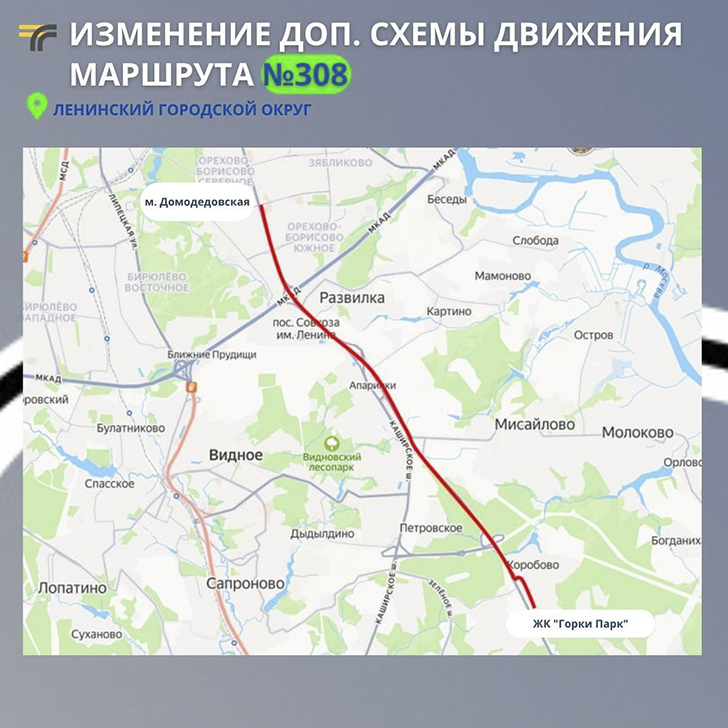 В целях улучшения транспортного обслуживания ЖК «Горки Парк» в Ленинском городском округе изменили дополнительную схему движения маршрута №308. Как отметили в Минтрансе Подмосковья, автобусы теперь заезжают внутрь жилого комплекса, следуя по улице Взлётной.
