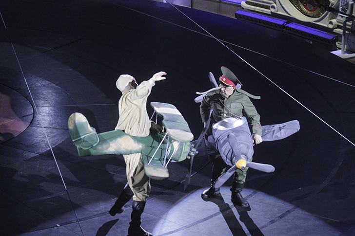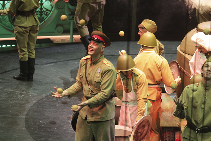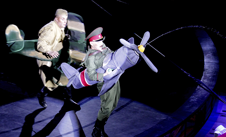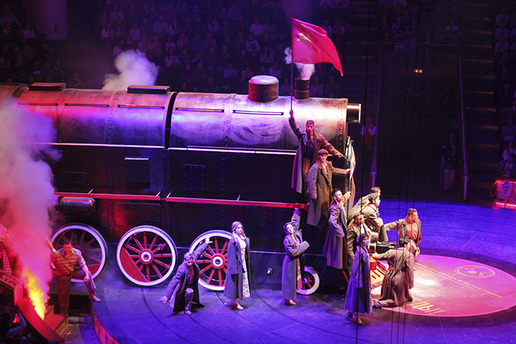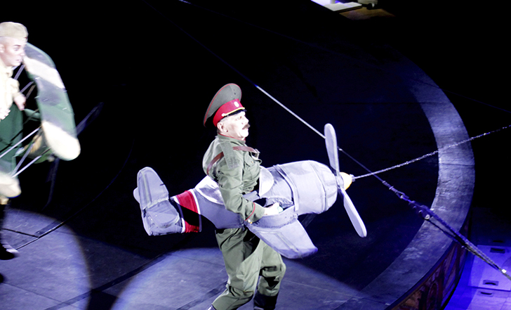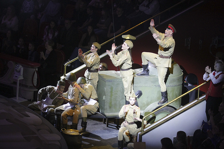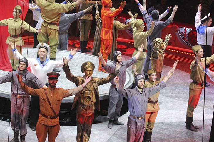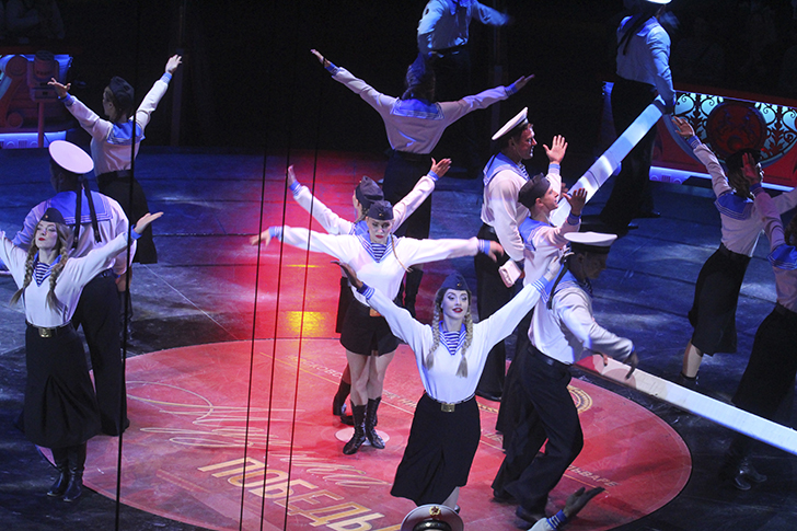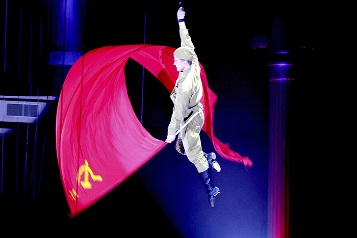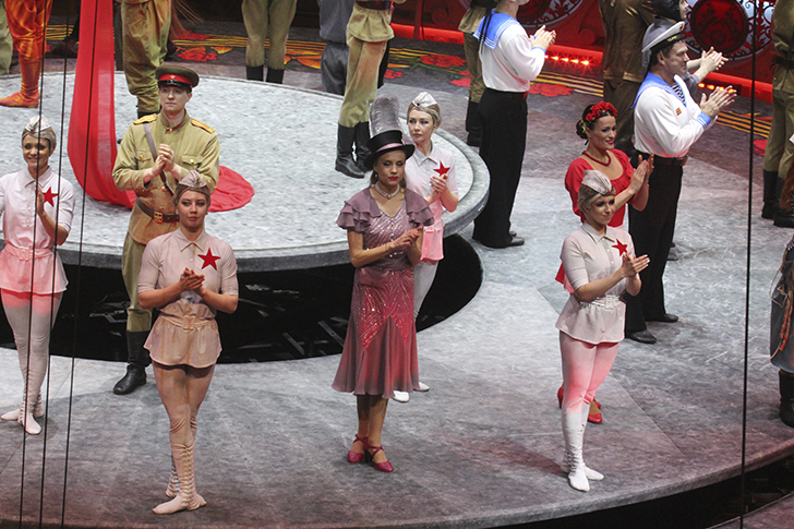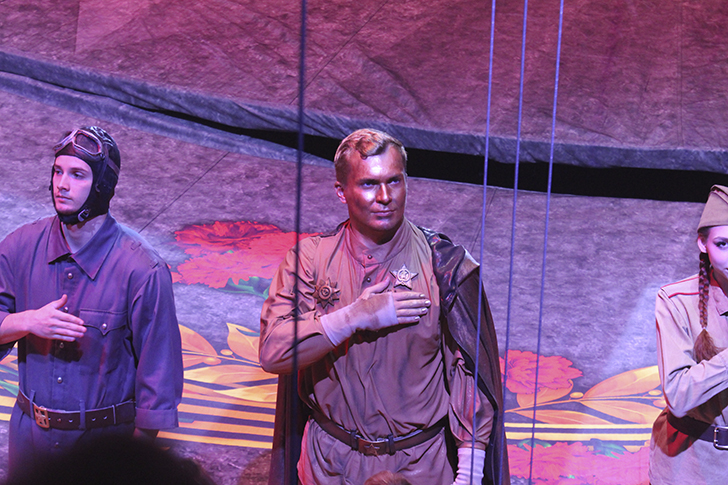 Мультимедийный задник тонко меняет изображения, усиливая эффект присутствия, а костюмы и антураж точно соответствуют духу времени. Здесь нет слабых мест, но некоторые выступления заслуживают отдельных оваций. «Вставай, страна огромная!» — мощный акробатический номер с шинелями, локомотивом, знаменем и звездой, заряжающий невероятной энергией. «Смуглянка» — романтический и воздушный номер под куполом.