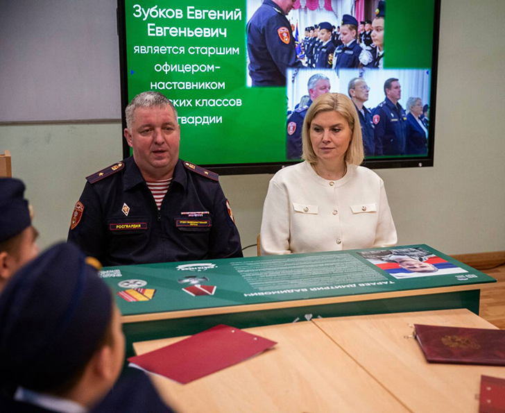 Офицер-наставник подшефных классов начальник Подольского отдела вневедомственной охраны майор полиции Евгении З. поделился с кадетами своим опыте службы. Он прошёл обе Чеченские кампании, где демонстрировал решительность и самоотверженность. За проявленный героизм офицер Росгвардии был награждён медалью Суворова — одной из высших воинских наград Российской Федерации.