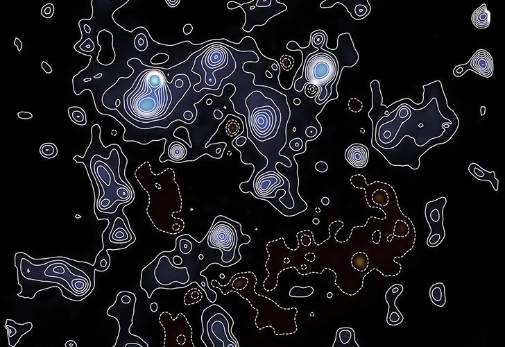 На главном фото: с использованием данных космического телескопа «James Webb» астрономы создали одну из самых детальных карт темной материи, отследив, как ее гравитация искривляет свет далеких галактик. Синие контуры показывают области с наибольшей концентрацией темной материи, формирующей невидимый каркас видимой Вселенной. Credit: Dr Gavin Leroy/COSMOS-Webb collaboration