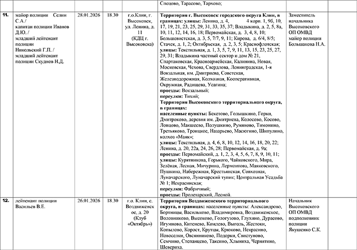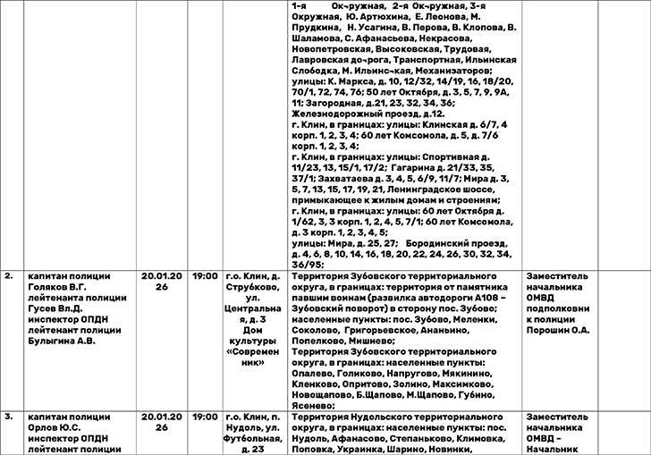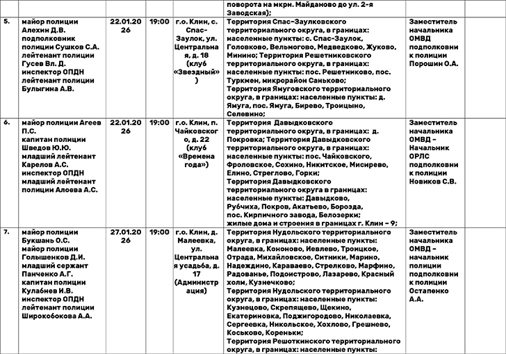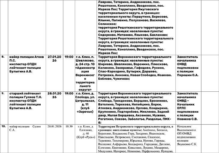 Предлагаем Вашему вниманию график проведения отчетов перед населением участковых уполномоченных полиции ОУУППДН ОМВД России по городскому округу Клин по итогам за 12 месяцев 2025 года.