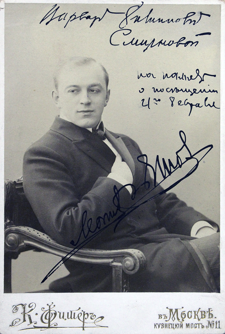 Очень интересным оказался снимок с изображением Леонида Витальевича Собинова с его личным автографом (оригинал) для баронессы Варвары Филипповны Смирновой.
