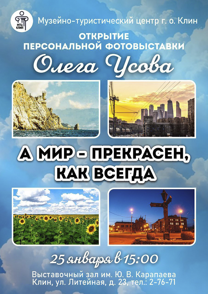 Выставочный зал имени Ю.В.Карапаева приглашает 25 января в 15:00 на открытие персональной фотовыставки Олега Усова «А мир – прекрасен, как всегда».