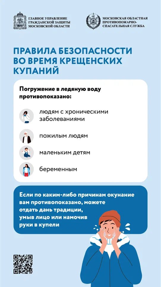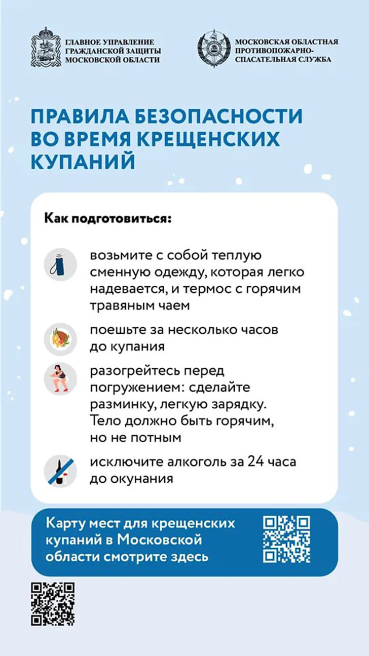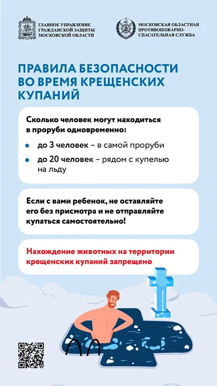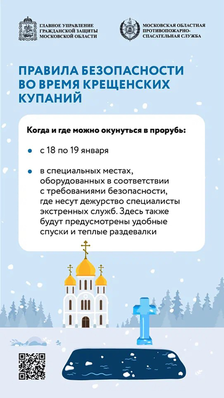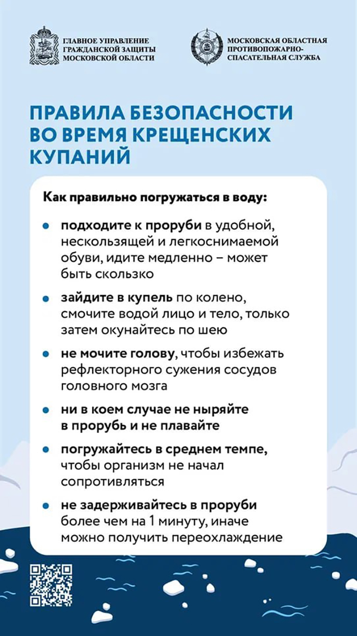 В ночь с 18 на 19 января православные верующие отметят один из главных христианских праздников – Крещение Господне. Традиционно в этот день тысячи людей принимают участие в крещенских купаниях, погружаясь в воду в специально обустроенных прорубях – иорданях. Однако такое погружение в ледяную воду – серьёзное испытание для организма, сопряжённое с высокими рисками для здоровья. Чтобы традиция не обернулась трагедией, спасатели ГКУ МО «Мособлпожспас» рекомендуют соблюдать правила безопасности.