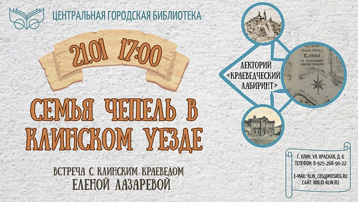 Центральная городская библиотека приглашает 21 января в 17:00 на лекторий «Краеведческий лабиринт» «Семья Чепель в Клинском уезде».