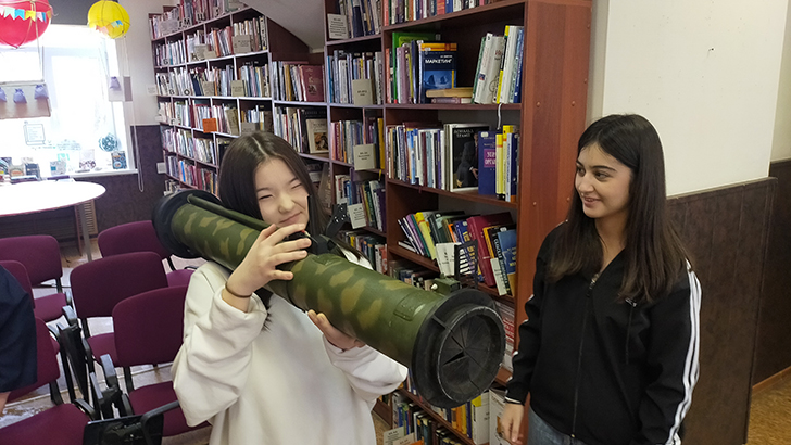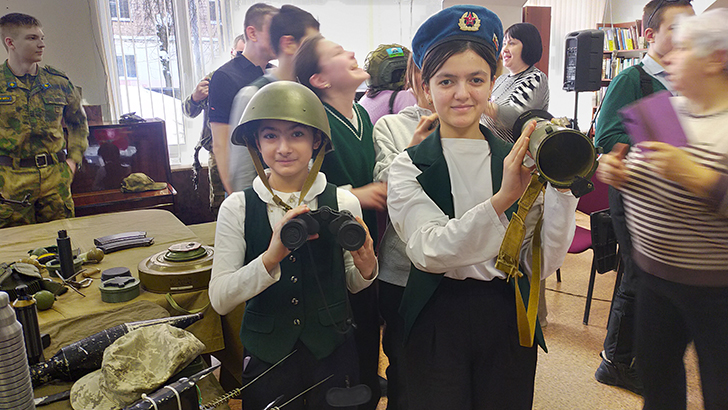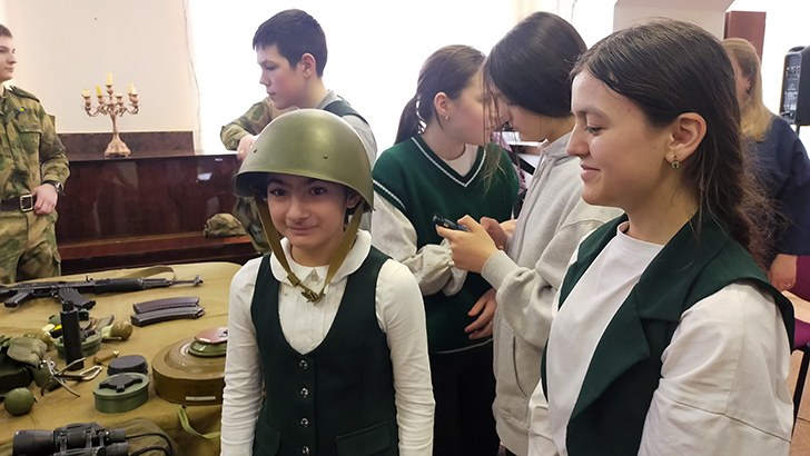 А потом началось самое интересное. Ребятам дали возможность не просто увидеть — прикоснуться. К современным автоматам. К каскам сорок первого. К осколкам снарядов, хранящим тепло минувших боёв.