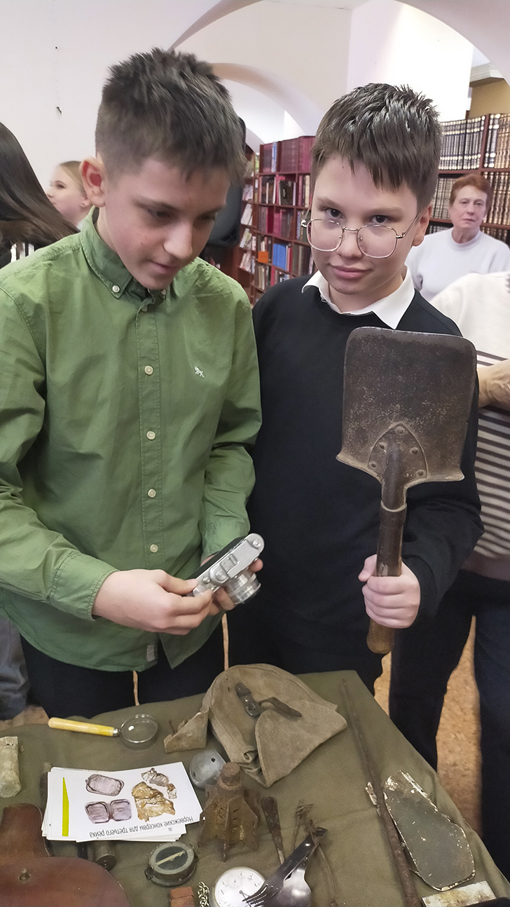 Краевед Василий Кузьмин принёс с собой не просто экспонаты — он принёс эхо войны или голоса из-под земли. Трофейная каска, пробитые пулями котелки, личные солдатские вещи, так и не нашедшие своих хозяев. Каждый предмет — это как страница недочитанной книги.