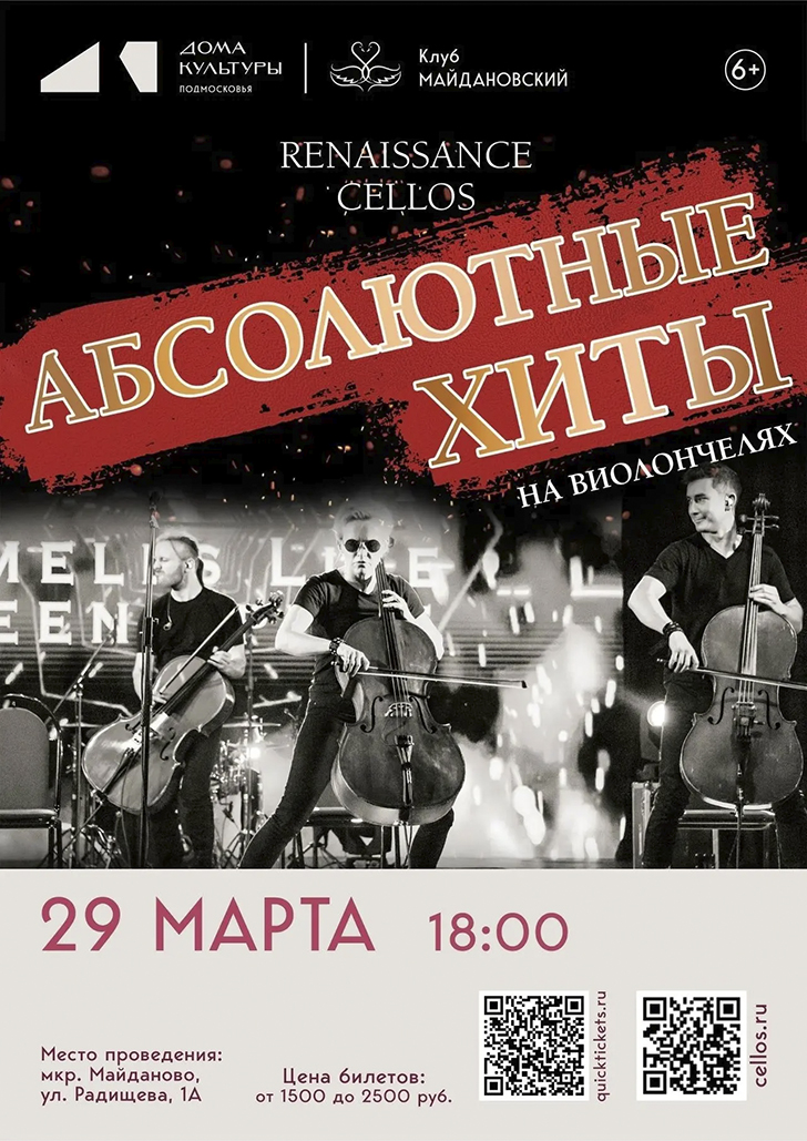 Renaissance Cellos, с программой «Абсолютные Хиты». Невероятные мелодии культовых мировых звезд ABBA, Queen, Michael Jackson, Lady Gaga, The Beatles, Scorpions, Deep Purple, Celine Dion, Adele, Billie Eilish, Muse, Eurythmics и многих других исполняются живьем четырьмя гениальными виолончелями в сочетании с вдохновляющим фортепианным сопровождением и ритмичным мастерством на ударных инструментах.