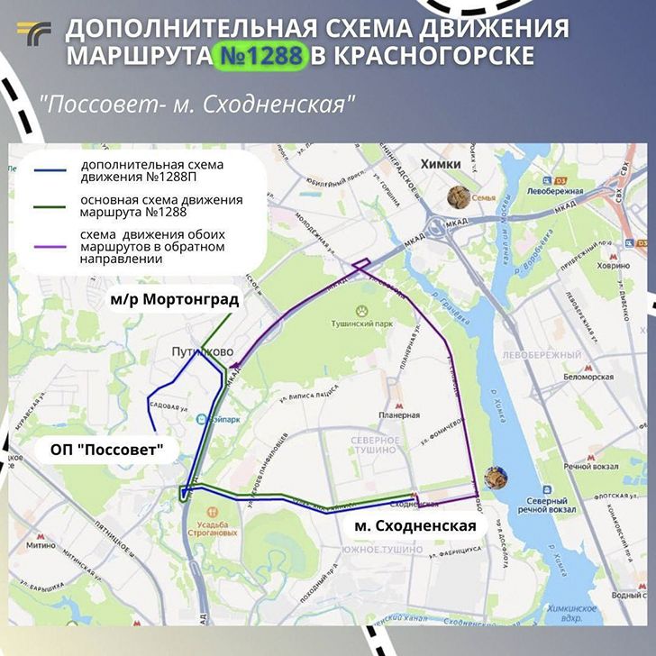 В рамках действующего маршрута №1288 «Красногорск (м/р Мортонград) — Москва (м. Сходненская)» начнёт работать дополнительная схема движения в сообщении «Поссовет — м. Сходненская».