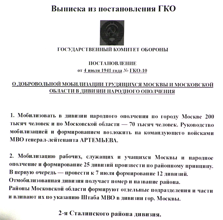 Речь товарища Сталина, прозвучавшая 3 июля 1941 года, собрала патриотов на защиту Отчизны. Постановлением от 4 июля обязанности по формированию дивизий народного ополчения были возложены на командующего Московским военным округом генерал-лейтенанта Артемьева. По Москве было мобилизовано 200 тысяч человек, по Московской области — 70 тысяч.