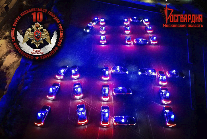 На одной из площадок региона развернулась зрелищная композиция: 30 патрульных автомобилей вневедомственной охраны выстроились в символичную надпись «10 лет». Свет фар, чёткая геометрия построения и слаженность действий участников создали яркий визуальный образ, олицетворяющий единство, преемственность традиций и уверенное движение вперёд.