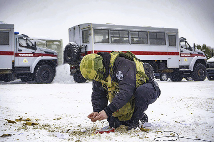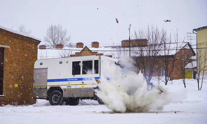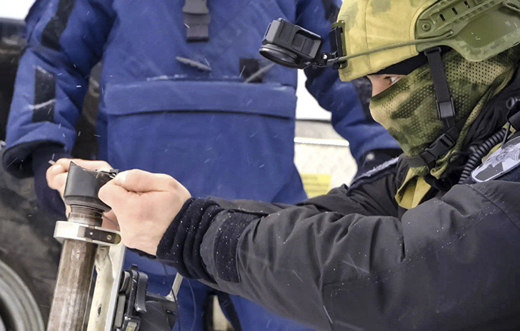 На первом этапе бойцы продемонстрировали алгоритм действий при обнаружении взрывоопасного предмета. С помощью минно-разыскной собаки было определено наличие взрывчатого вещества, после чего условное взрывное устройство было нейтрализовано с использованием дрона.