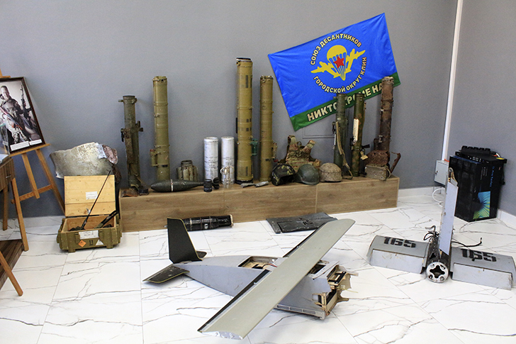 В витринах музея — то, что видело передовую. Пробитые каски, шевроны, флаги, осколки снарядов, приборы ночного видения, трофейное оружие. Но самое ценное здесь не это. Самое ценное — личные вещи: нательный крест, найденный в бронежилете бойца, пожелтевшее письмо из дома, детский рисунок, привезённый с передовой.