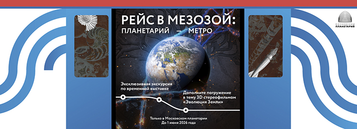 Экскурсия включает в себя посещение зоны временной выставки «Рейс в мезозой: ПЛАНЕТАРИЙ – МЕТРО» в музее Урании и просмотр фильма «Эволюция Земли» в 4Д-кинотеатре. Ближайшие даты: 17, 19, 24 и 26 апреля.