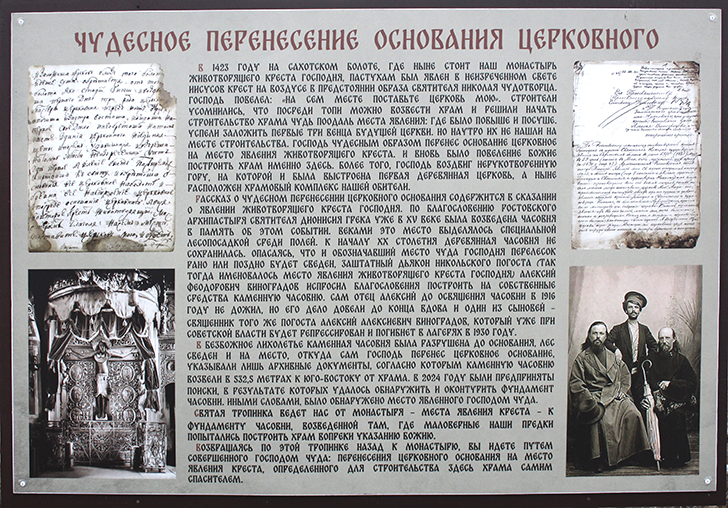 История обретения этой святыни началась 11 июня 1423 года. Пастухам, пасшим скот на Сахотском болоте, явилось дивное видение: стоящий на воздухе Животворящий Крест Господень. А перед образом распятия стоял сам великий чудотворец Николай со святым Евангелием в руках. И было дано обетование: «Будет на сем месте благодать Божия и дом Божий; аще кто с верою придет помолитися, будут многая исцеления и чудеса от Животворящего Креста молитв ради чудотворца Николы».
