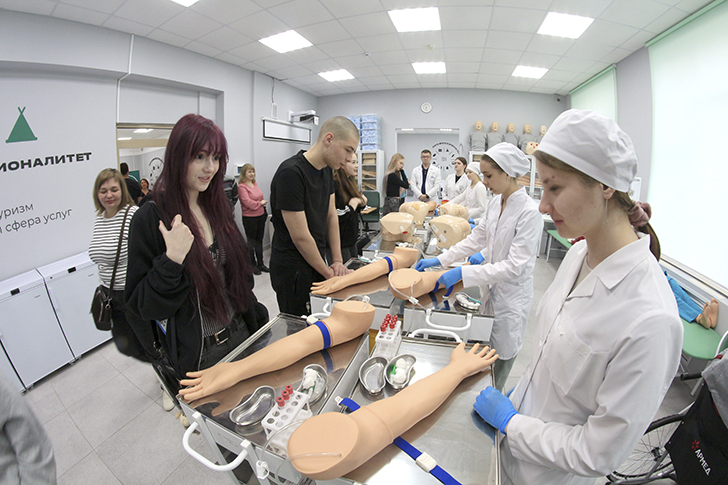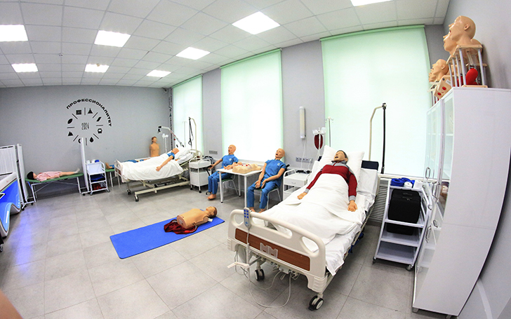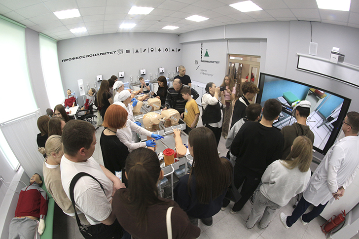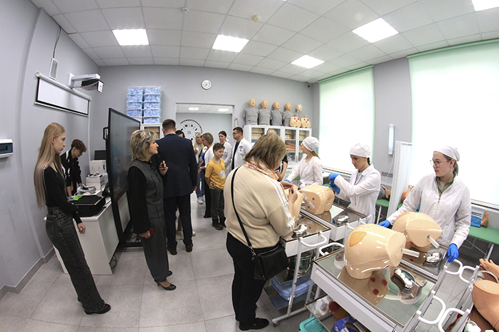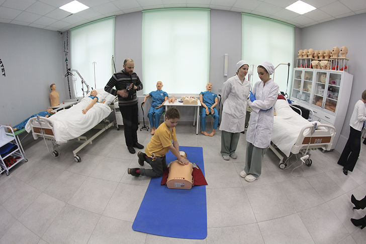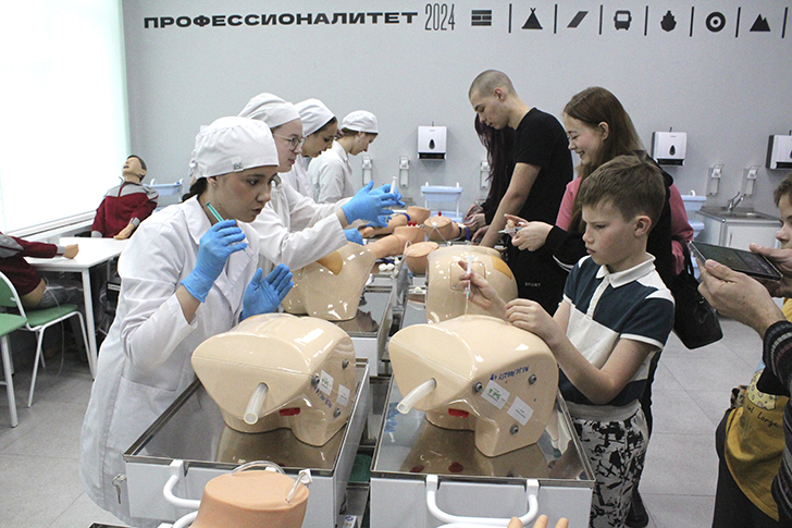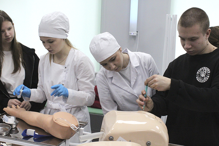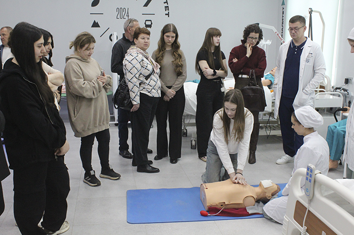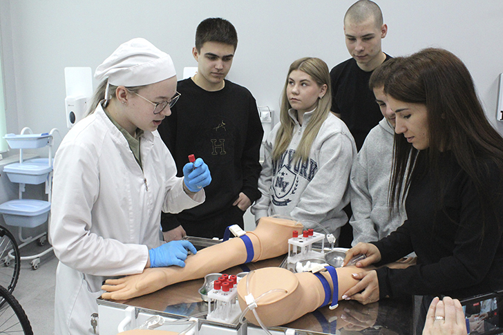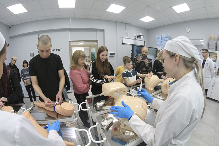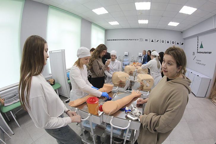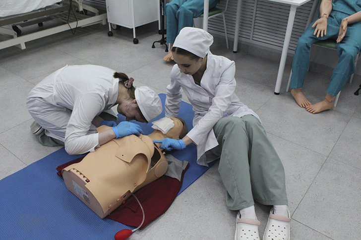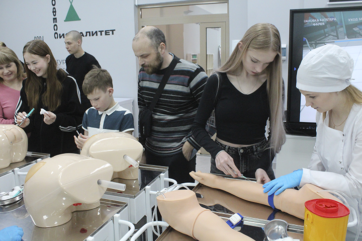 Особенно тепло и трепетно было на факультете «Сестринское дело». Здесь не просто аудитория — здесь маленький храм милосердия. Студентки второго курса, ещё сами почти девчонки, но уже с уверенными, точными движениями, показывали на манекенах главное: как сделать укол в мышечную ткань, чтобы не было больно, как взять кровь из вены, чтобы не страшно, а главное — как заставить биться остановившееся сердце. Это похоже на магию. Только магия здесь настоящая, медицинская.